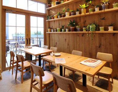 木目と白を基調とした緑がいっぱいの明るい店内と爽やかなテラス席を併設。