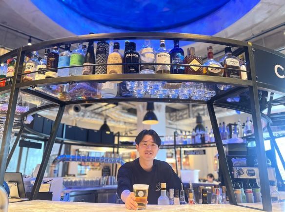 バーカウンター頭上のアクアリウムが生み出す